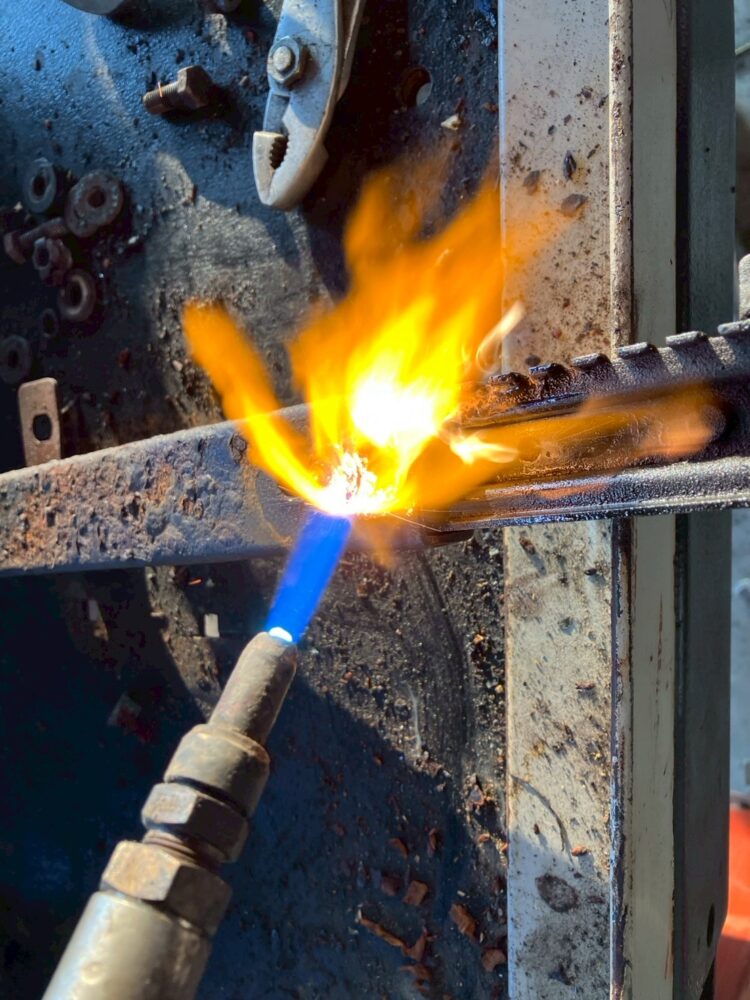 続いてシートレールから固着したボルトを外すために、アセチレンと酸素で炙ります。これが案外時間がかかりました……。