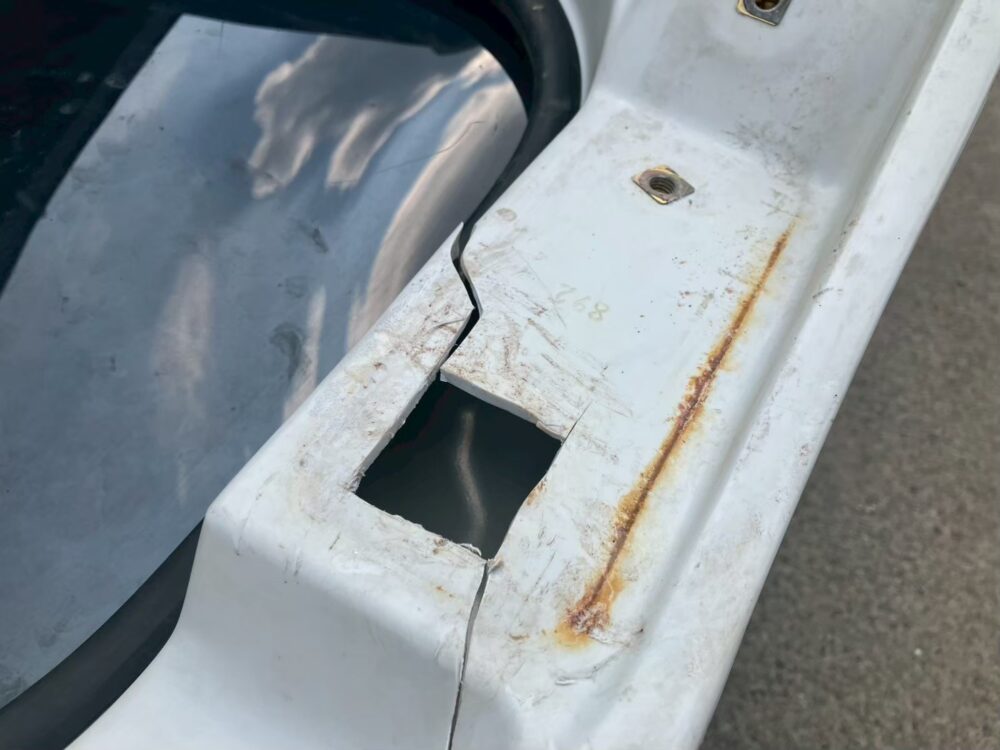 ぱっと見だと、丸ごと交換?と思われるかもしれませんが、フロント部分がかなり大きくひび割れています。ボルト取付部も完全に破損しており、これでは補修は難しいです。