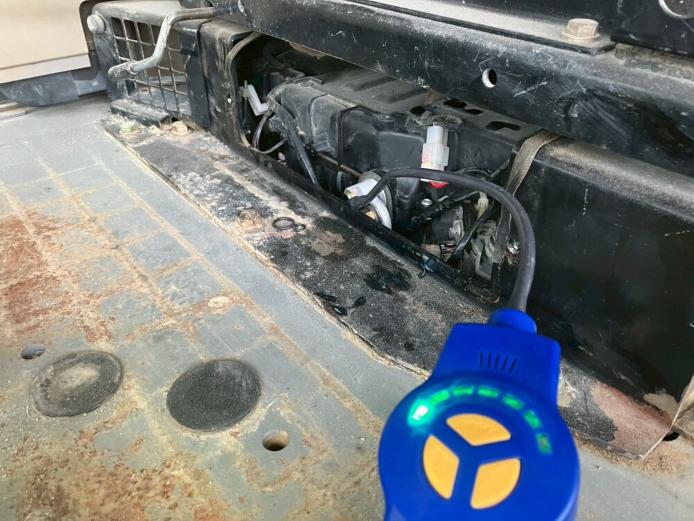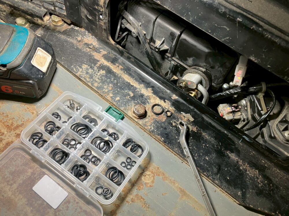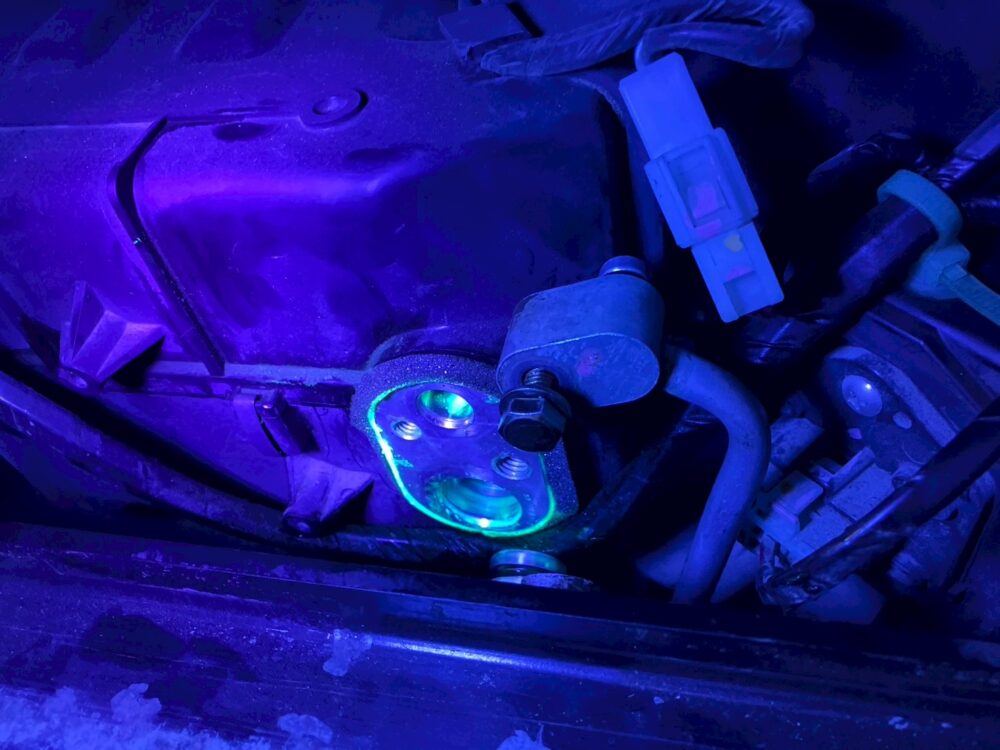 真空引き(配管内を真空にする作業)を行い、蛍光材を入れて漏れがないか点検しました。すると、エバポレーター付近からのガス漏れを確認。ガス配管のOリングを交換し、エアコンガスを注入します。