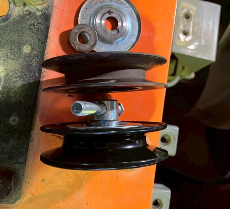 エアコンベルト調整のプーリーの交換から行います。プーリーとは、エアコンベルトを掛けて動力を伝達させる滑車のような部品です。これが劣化すると、エンジンルームから異音が聞こえてきたりします。稼働時間や使用状況により変動はありますが、2.3年に一度は点検を行いましょう。