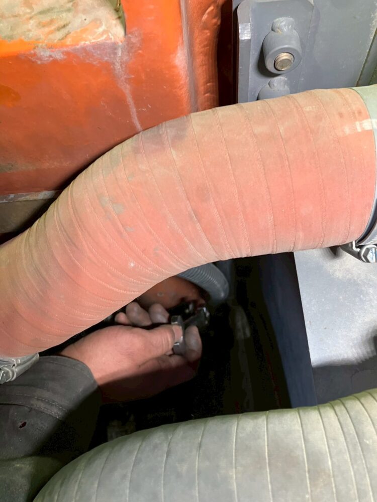 まずは、ファンカバーを外してエンジンルーム内を確認します。日立の後方小旋回機はエンジンルームがとにかく狭いので、作業するのに苦労します。それでもがんばります。