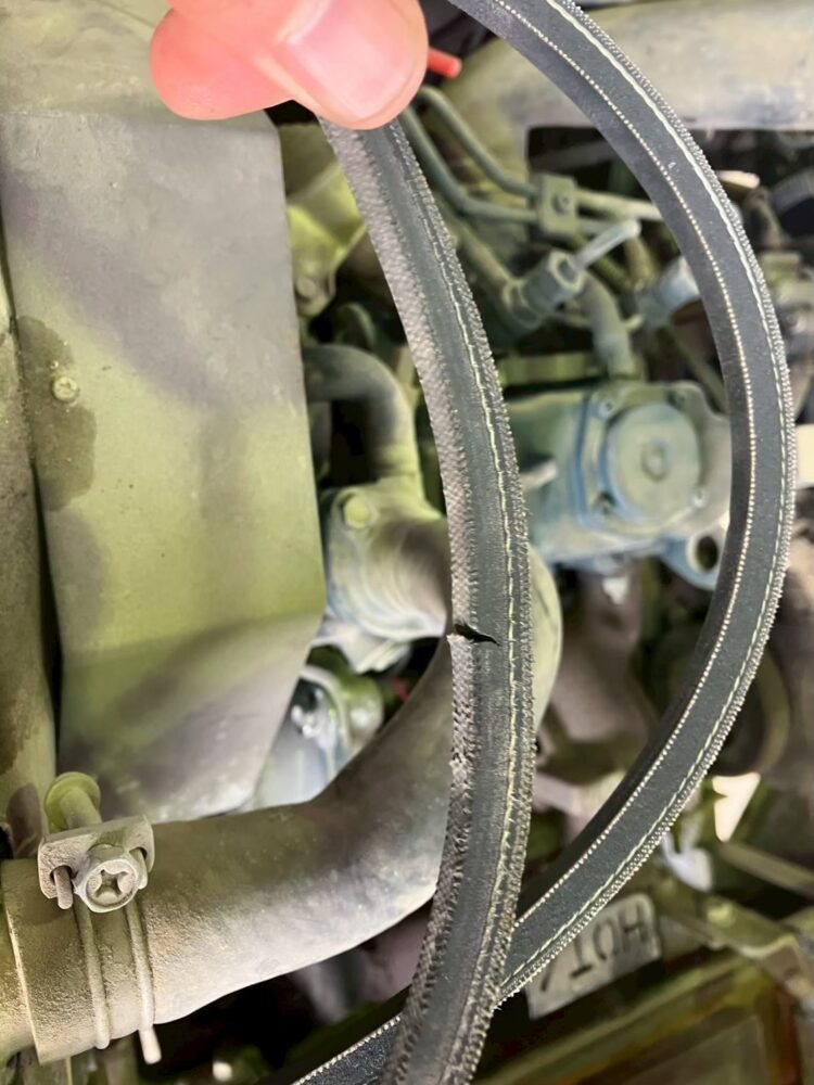 交換前のファンベルトは亀裂が入って切れかかっています。ファンベルトが切れてしまうと、オーバーヒートの原因となり、エンジンを痛めつけてしまいます。