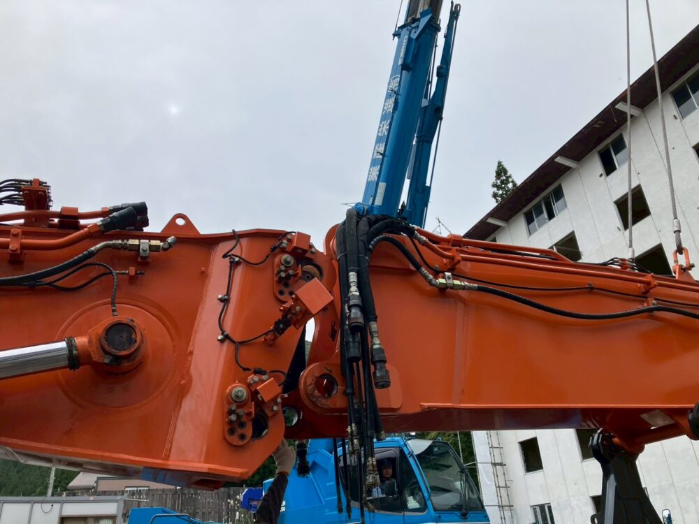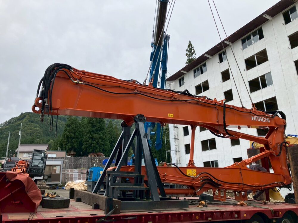 本日は日立建機のマルチブーム仕様機・ZX350LCK-6の現場での組立作業の様子をお届けします。こちらの機械は、なんと作業装置を3段階の長さに変更できる解体仕様の機械です。日立建機さんのHPでそれぞれの仕様の違いを見ることができますので、ぜひご覧ください。先に見ていただいた方が作業内容のイメージがつきやすいです!