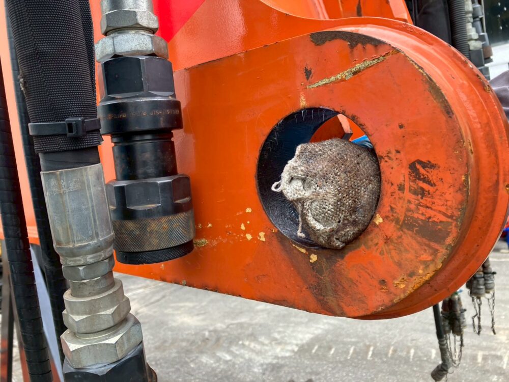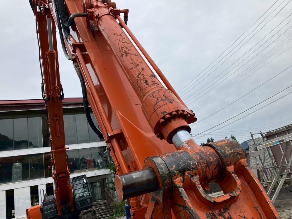 バケットシリンダーに大きな傷と油漏れがあることを事前に共有していただいていたので、再生品と交換していきます。