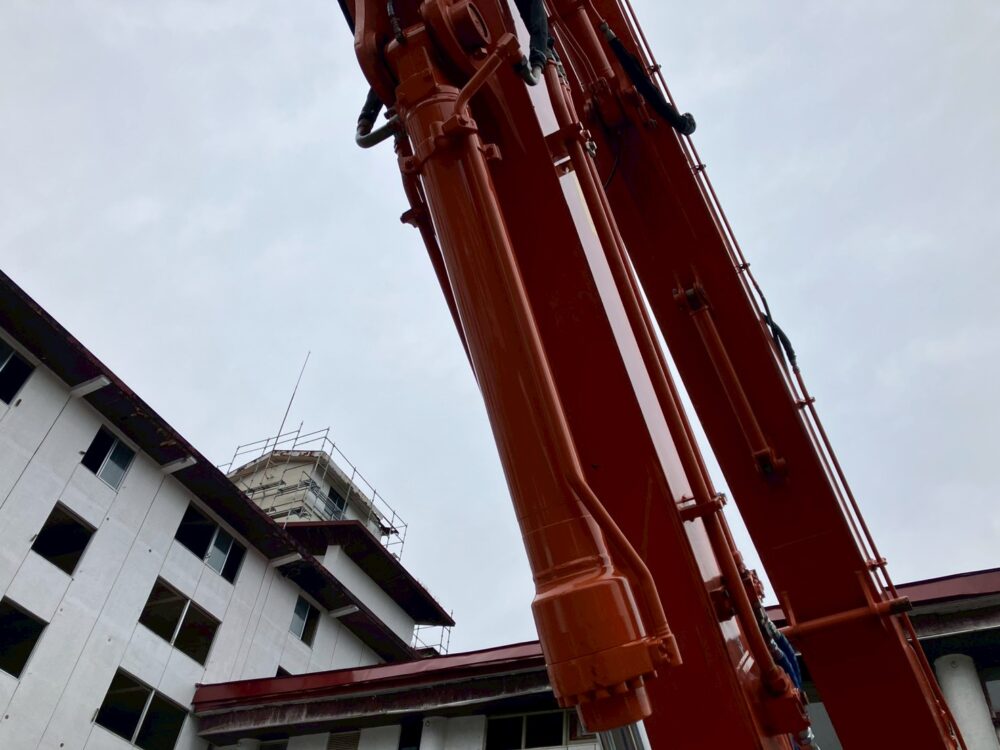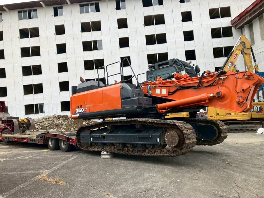 今回、ホテル跡地の解体作業でZX350LCK-6を使用していきます。ハイリフトフロント仕様にすると、ブームとアームの長さはなんと23m(ビル6階分)にもなります。まさに高所の解体作業に適任です。