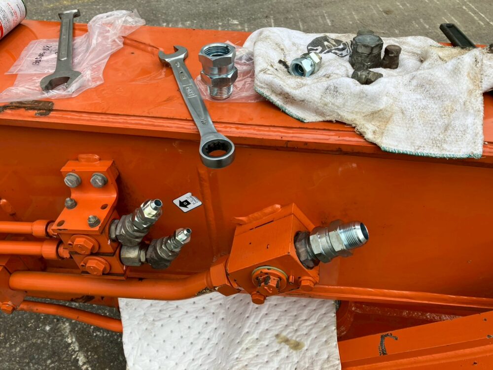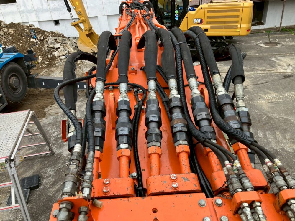 解体で使用するアタッチメントに合わせて配管の金具を付け替えます。これで作業装置の組付作業は完了です。