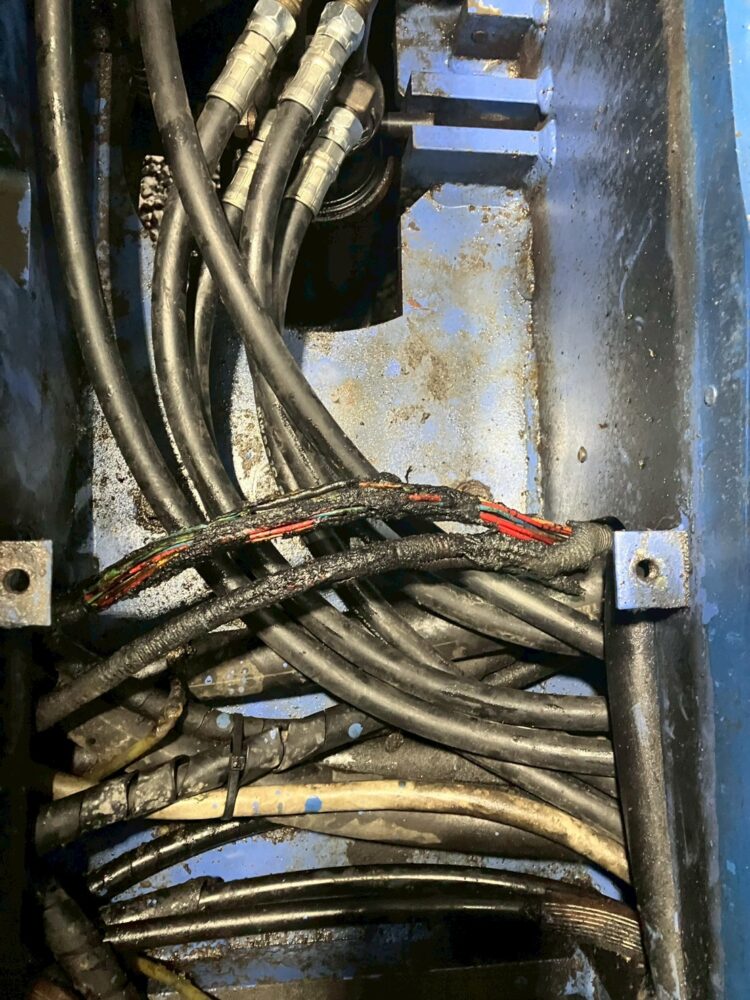 本日は、前田製作所の高所作業車・HF090-3の出張修理の様子をお届けします。こちらの高所作業車でガス切断作業をしていたところ、旋回体が燃えてしまったとのことです。怪我をした方はいなかったそうなので、そこはよかったです。出火原因まではわかりませんでしたが、燃えてしまったところは古いグリスなどが溜まっており、引火しやすくなっていました。