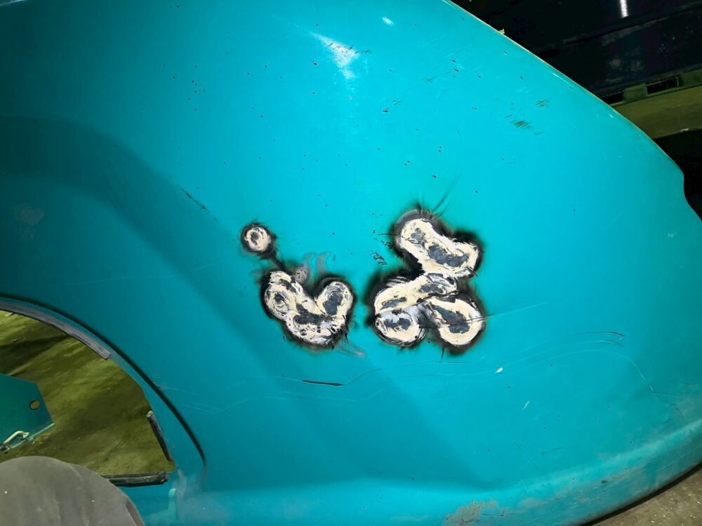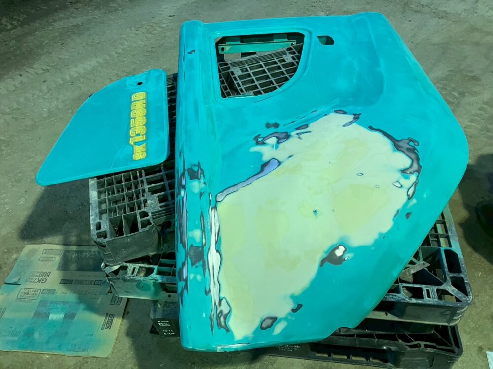 本日は、コベルコ建機のバックホー・SK135SRD-7の右サイドカバー板金塗装の様子をご紹介します。ぶつけてかなり凹んでしまい、見た目を改善したいとのことでご依頼いただきました。