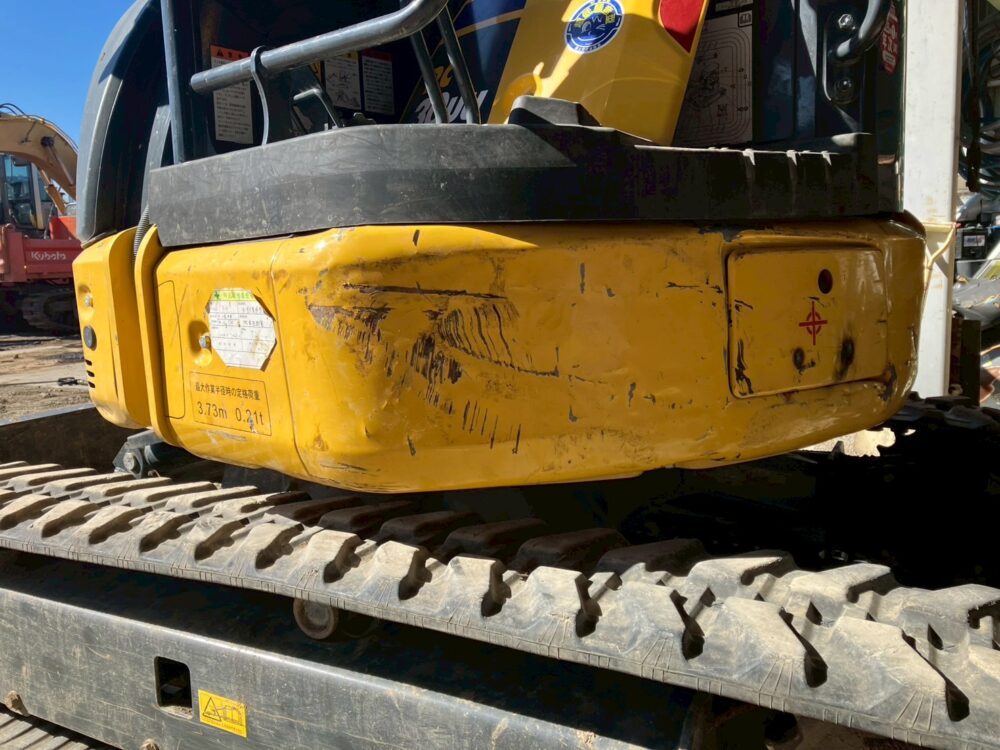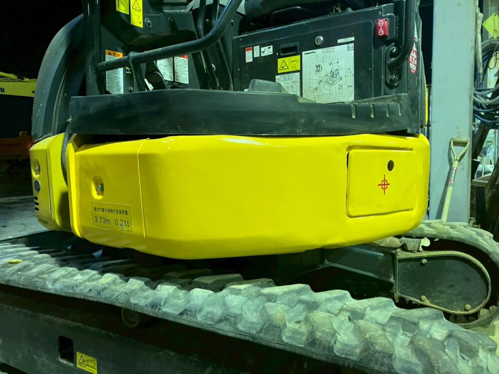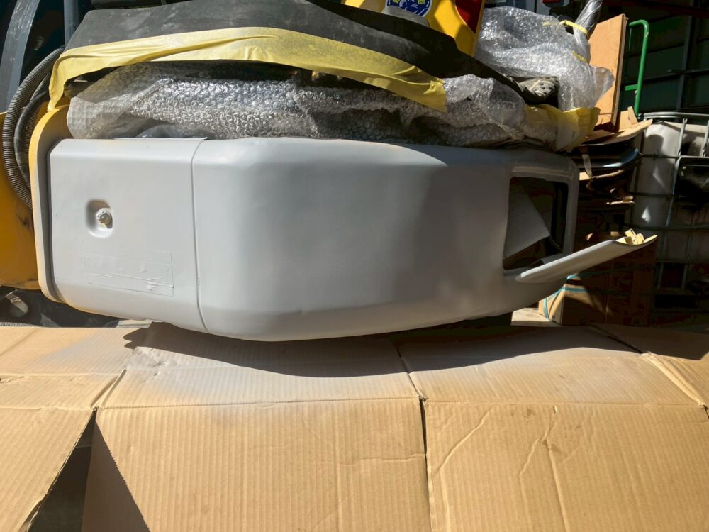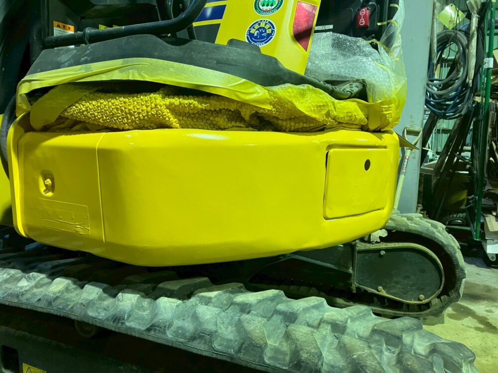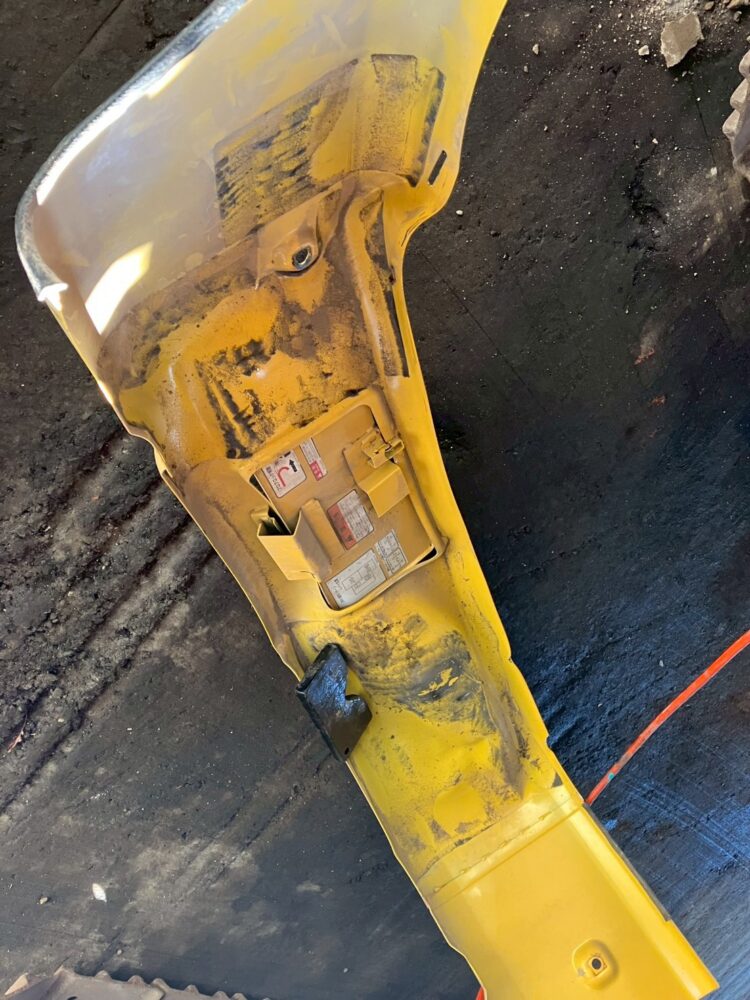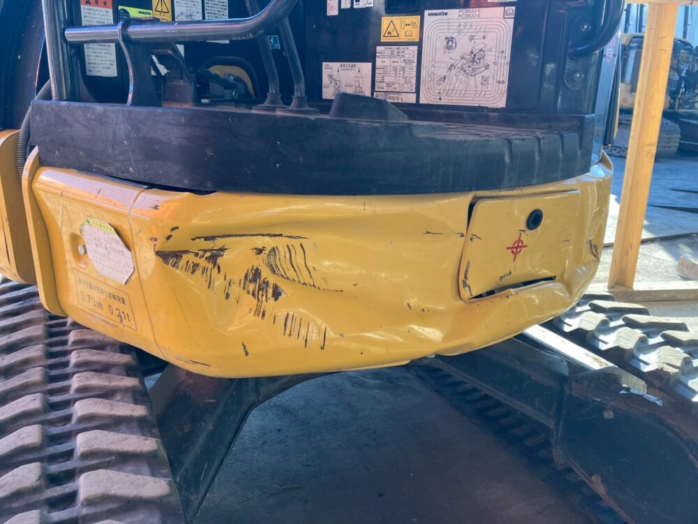 本日は、コマツのユンボ・PC30UU-6の左スカートの板金修理の様子をお届けします。Beforeの画像を見てわかるとおり、かなりバッコリと凹んでしまっています。本来であれば、交換が推奨される凹み具合ですが、「予算の都合上、見た目はある程度でいいので板金でお願いします。」とご依頼いただきましたので、板金で対応していきます。