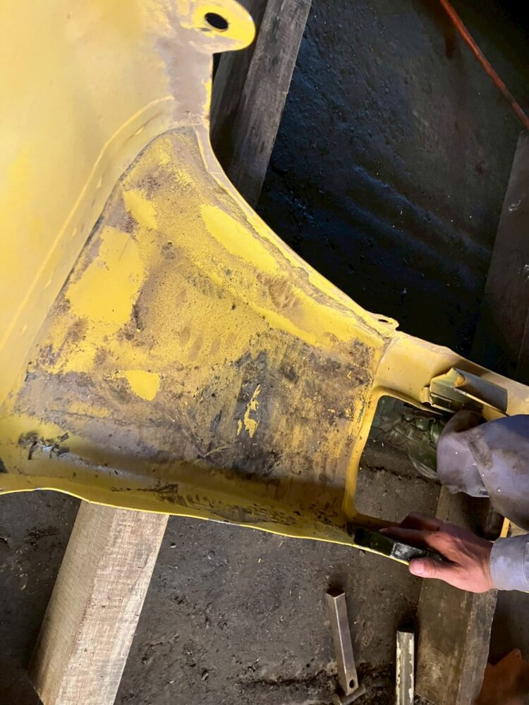 板金塗装・溶接関連 コマツPC30UU-6 左スカート板金修理 before 修理前の様子です。画像越しでもかなりベコベコなのが伝わります。 after 小窓部分も含め、綺麗に仕上がりました。カバーごと交換だとかなり高額になってしまいますが、板金塗装でしたら費用をかなり抑えることができます。 ご依頼背景 こんにちは、彩重機エンジニアリングです。 本日は、コマツのユンボ・PC30UU-6の左スカートの板金修理の様子をお届けします。Beforeの画像を見てわかるとおり、かなりバッコリと凹んでしまっています。本来であれば、交換が推奨される凹み具合ですが、「予算の都合上、見た目はある程度でいいので板金でお願いします。」とご依頼いただきましたので、板金で対応していきます。 【修理方法】 左スカートを外し、裏からある程度押し出し、ハンマーなどで微調整をする。 小窓部分も溶接部を削って外して調整する。 本体と合致するよう、外す→叩き出す→合わせるを繰り返す。 マスキングを施し、パテを盛る。 サフェーサー処理を行う。 本塗装。 マスキングを剥がして作業完了。 * サフェーサー処理とは、本塗装の前の下地処理のことです。塗料の発色・密着を高め、防錆効果があります。彩重機では、全ての塗装でサフェーサー処理を施しております。 【同じようなお悩みの方へ】 カバーごと交換となると、部品代で数十万してしまうことも。「そこまではちょっと……。」という場合も、ある程度までなら板金塗装でなんとかできるかもしれません。しかし、冒頭で書いたとおり、本来は交換が推奨されます。パテを盛りすぎると、内部が完全に固まっていなかったり、ひび割れの原因となってしまうためです。 ですが、予算は限られていると思いますので、柔軟に対応いたします。一度お気軽にご相談くださいませ。 その他の板金塗装の修理事例はこちらから 大事な重機のその凹み、彩重機で直しませんか? LINEお友達登録で簡単相談!詳しくはこちら 詳細説明 左スカートを外し、裏側の様子です。 裏からある程度叩き出すことで、パテ盛り部分を少なくすることができます。パテの盛り過ぎはひび割れなどにつながります。 本体に取り付け、歪みを本体に合わせていきます。叩き出す→合わせるを何度か繰り返し、調整していきます。 パテを盛る→削るを繰り返し、形を整えます。 本塗装前の下地・サフェーサー処理を施します。 コマツナチュラルイエローを薄く吹き付け、何回か塗料を重ねます。 公式LINEからも問い合わせが可能です! 公式LINEお友達募集中! 友達登録で建機プロショップで使える お得なクーポンプレゼント! 048-501-6352 お電話でお問い合わせ受付:9:00~19:00 修理事例一覧シリンダー修理 エンジン関連修理 油圧システム修理 電気系統修理 走行装置・足回り修理 板金塗装・溶接関連 その他 定期メンテナンス